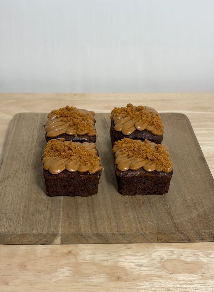 Fudgy brownie with a cookie butter swirl, topped with cookie butter cream and cookie crumble