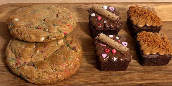 Fudgy brownie with chocolate hazelnut nut swirl and spread. Decorated with a wafer and Valentine sprinkle mix